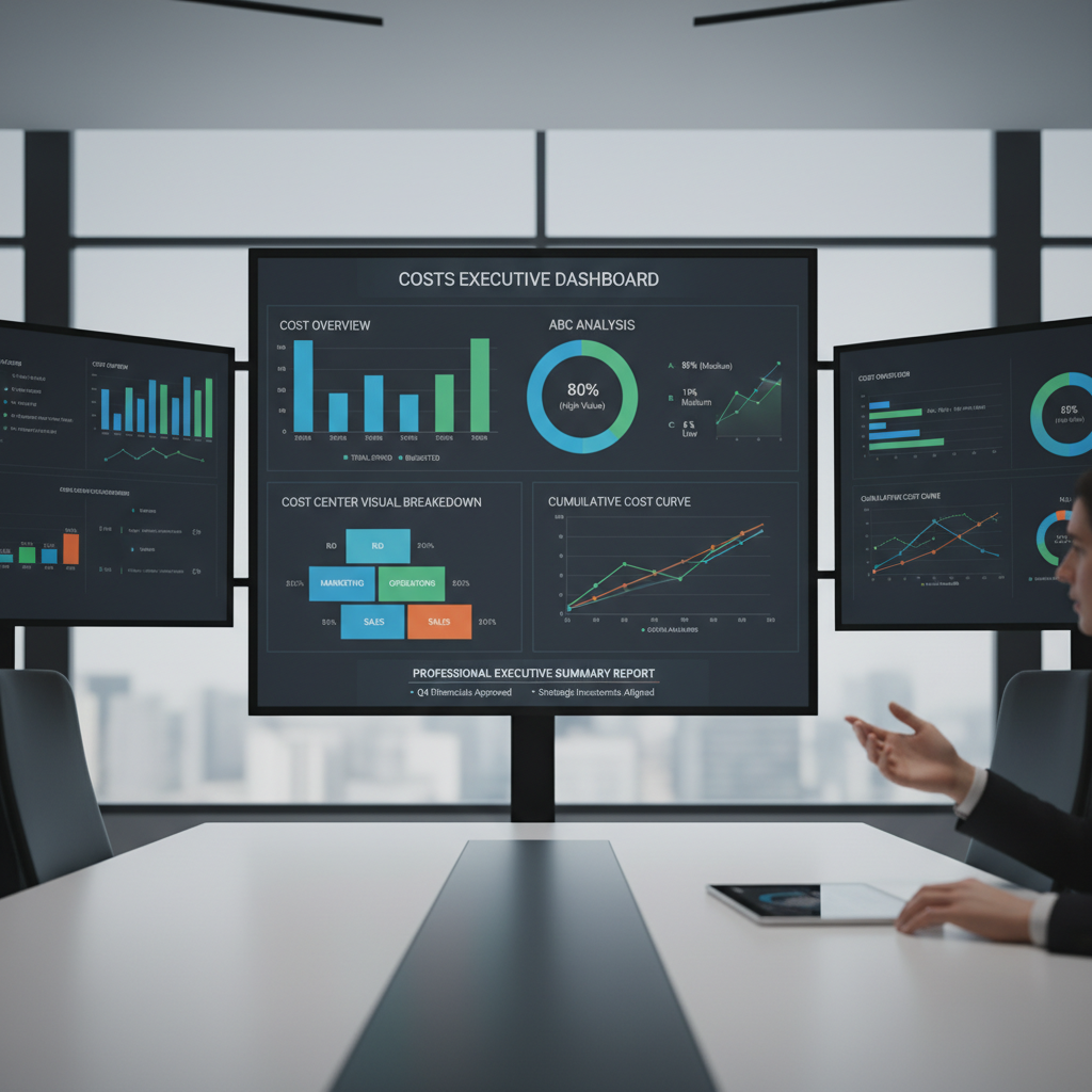 Versão definitiva do orçamento apresentada de forma visual e profissional, com gráficos que facilitam a compreensão dos custos. Material pronto para apresentação à diretoria e acompanhamento durante a obra.