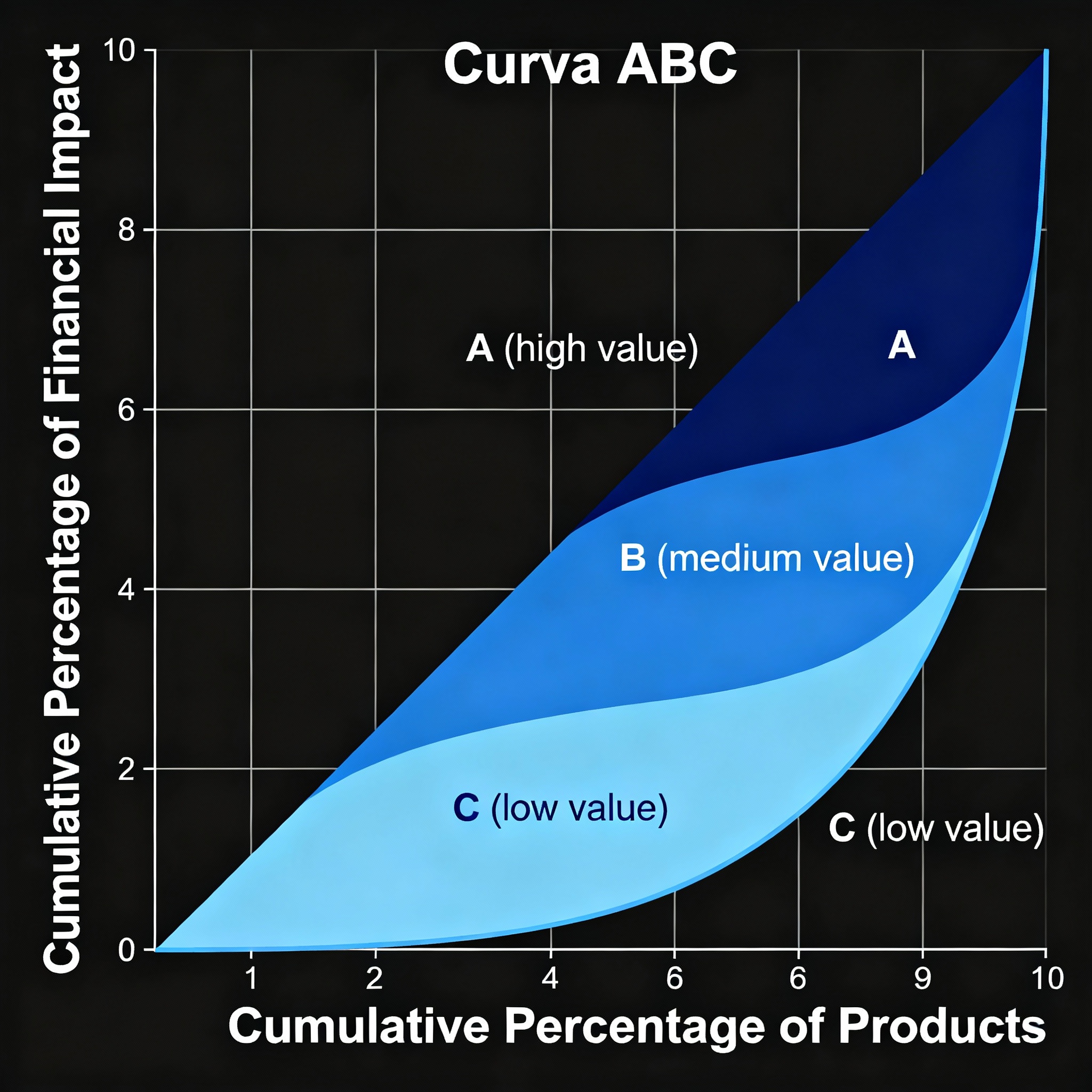 Classificação dos serviços e materiais por ordem de impacto no custo total. Os itens tipo "A" são os mais caros e críticos, merecendo atenção especial nas negociações. Isso ajuda a focar esforços onde realmente faz diferen_ça.