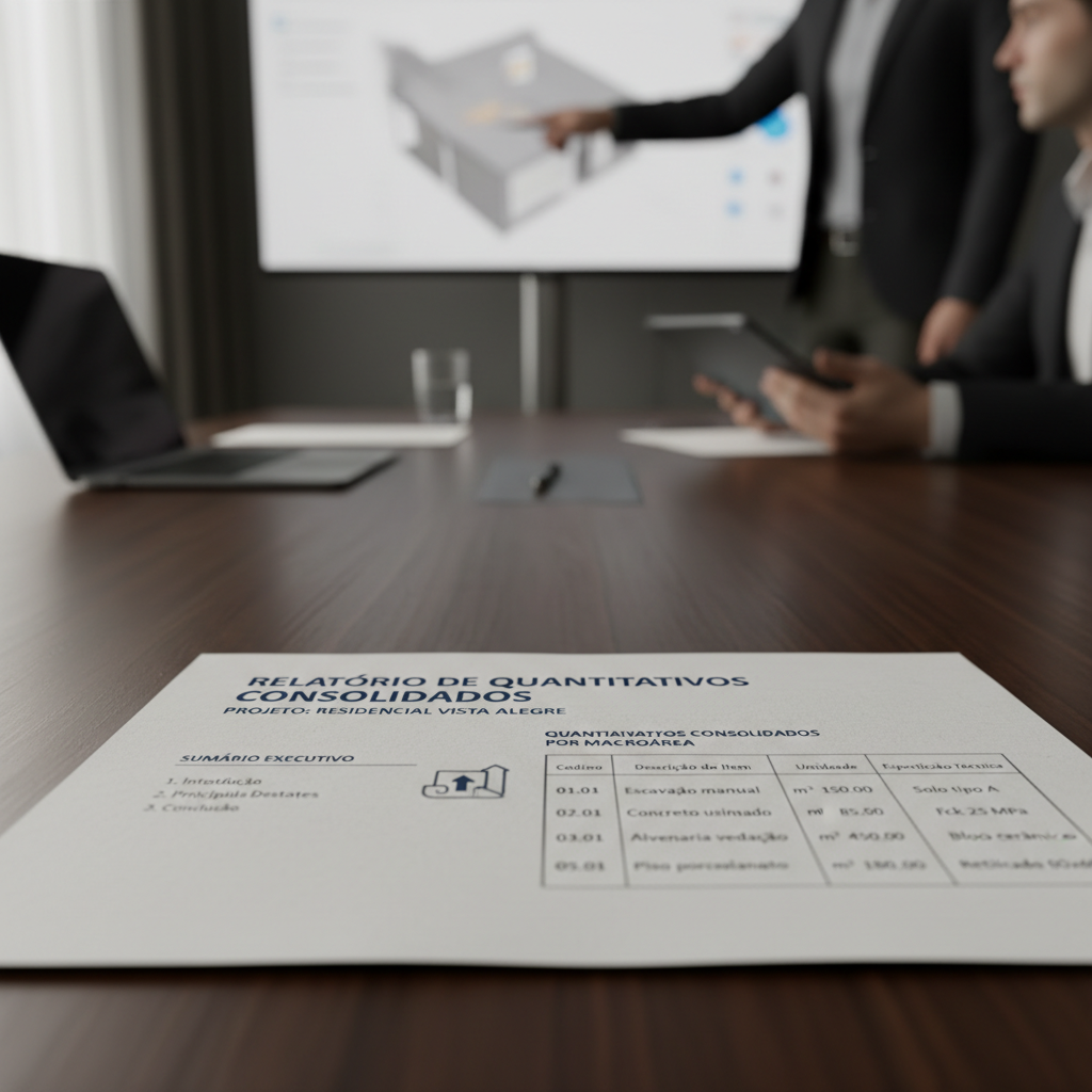Documento que consolida todos os volumes e especificações de forma clara e objetiva. Facilita a validação com o cliente e serve como referência durante toda a execução da obra.